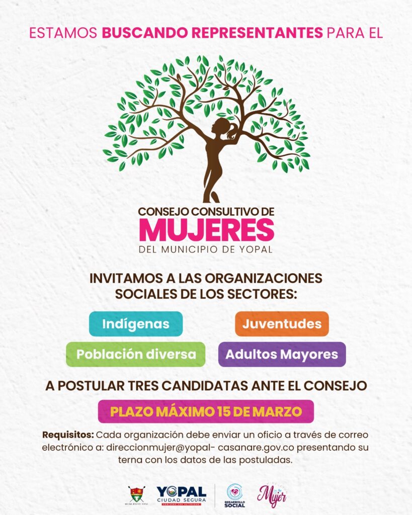 Hasta el quince de marzo está abierta la convocatoria para que las organizaciones sociales que agrupen mujeres indígenas, jóvenes, adultas mayores y de la población diversa, postulen a sus candidatas para conformar el Consejo Consultivo de Mujeres del Municipio de Yopal, un mecanismo de participación para la equidad.