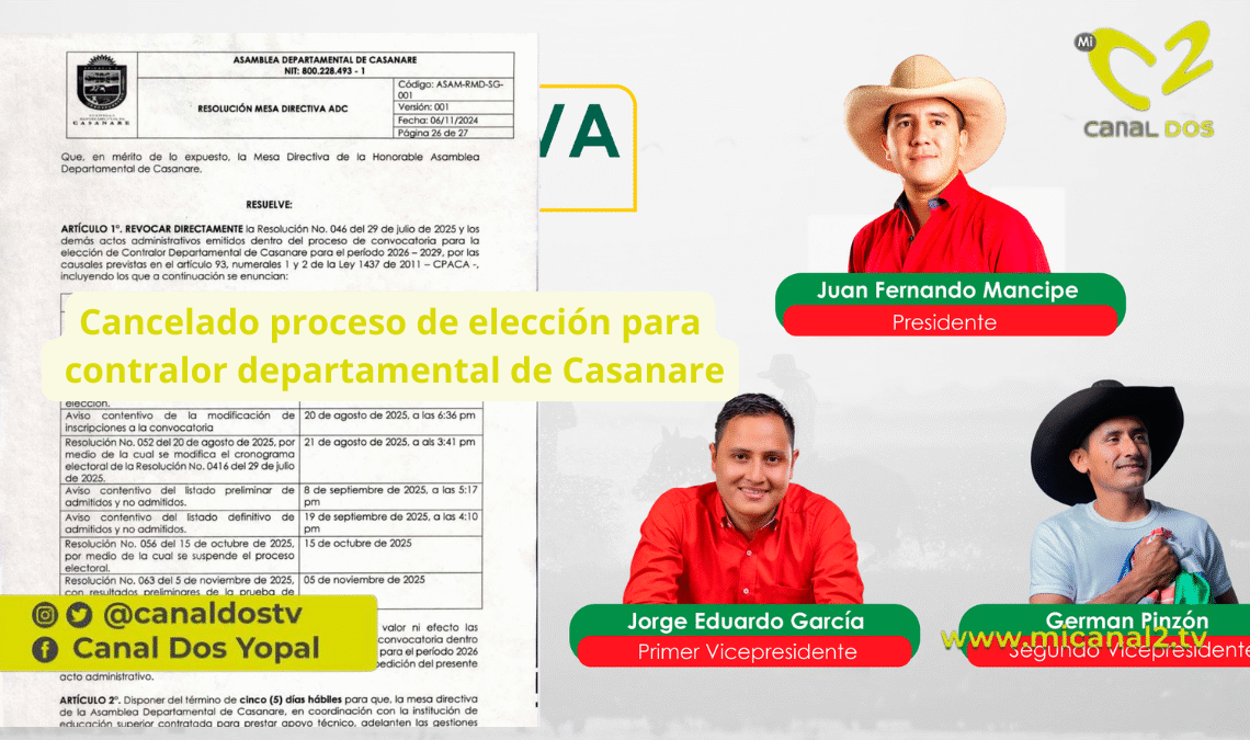 La mesa directiva de la Asamblea Departamental de Casanare decidió anular el proceso de convocatoria para seleccionar contralor departamental para el periodo 2026-2029. La medida fue oficializada mediante la Resolución No. 069, emitida este 13 de noviembre de 2025.