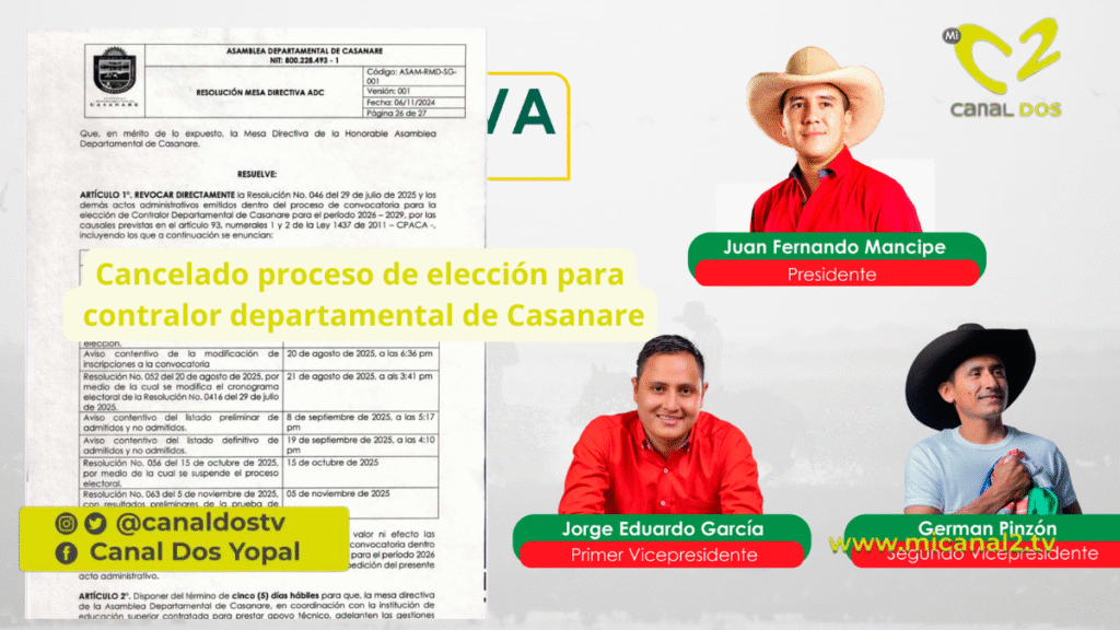 La mesa directiva de la Asamblea Departamental de Casanare decidió anular el proceso de convocatoria para seleccionar contralor departamental para el periodo 2026-2029. La medida fue oficializada mediante la Resolución No. 069, emitida este 13 de noviembre de 2025.
