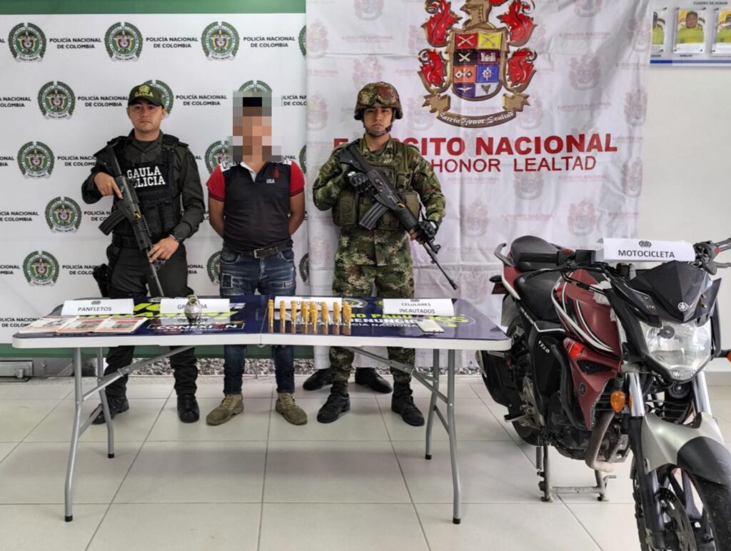 Durante el allanamiento y la captura se encontró en posesión de este sujeto una granada, cartuchos, un teléfono celular, una motocicleta y panfletos pertenecientes a esta estructura.