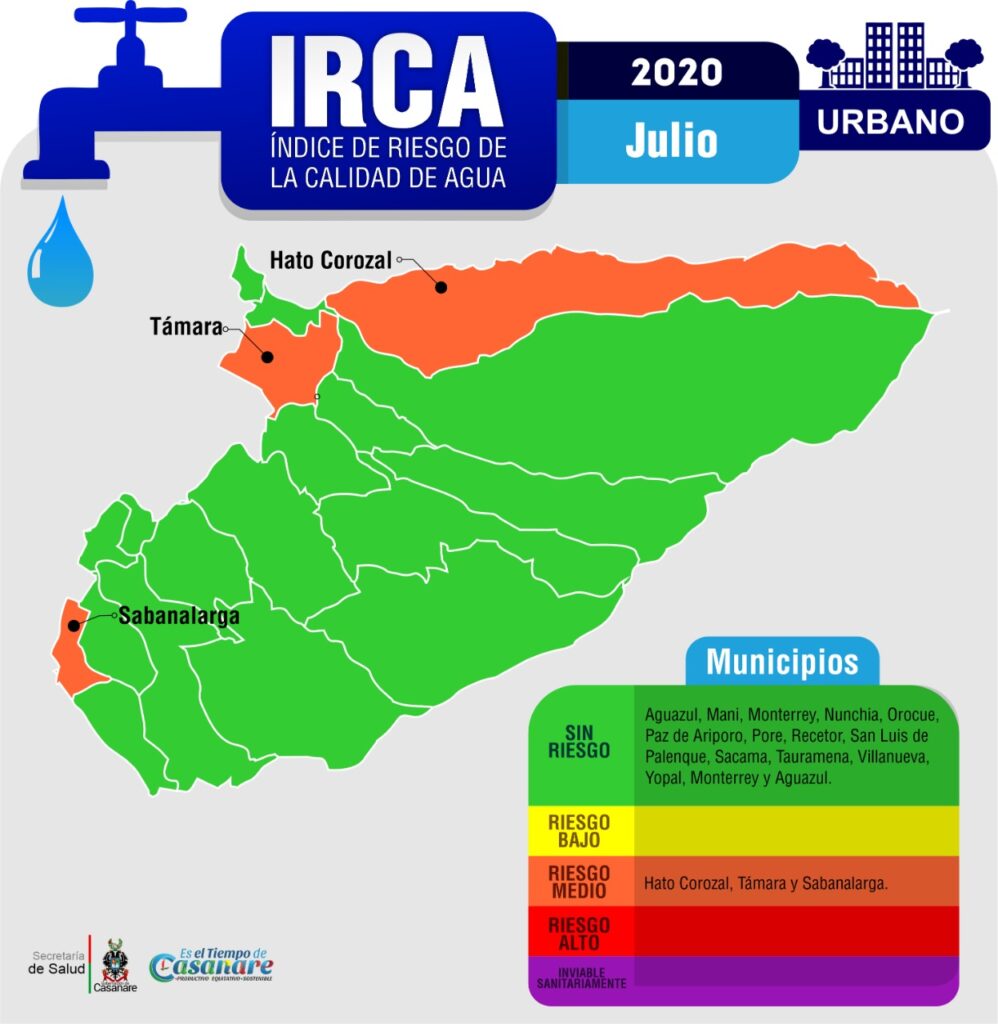 Por otro lado, para el caso específico de las cabeceras municipales, el IRCA correspondiente al séptimo mes del año destaca un resultado favorable para 16 de los 19 municipios del departamento, dejando solo a tres (3) de ellos en la categoría de riesgo medio, correspondientes a los municipios de Hato Corozal, Támara y Sabanalarga.