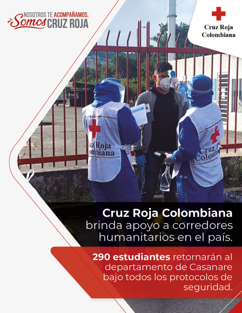 Cruz Roja Colombiana Seccional Casanare, en coordinación con las Seccionales de Antioquia, Cundinamarca y Bogotá, Boyacá y Santander dispusieron de corredores humanitarios para que estudiantes oriundos de Casanare puedan regresar a sus hogares, debido a la emergencia actual