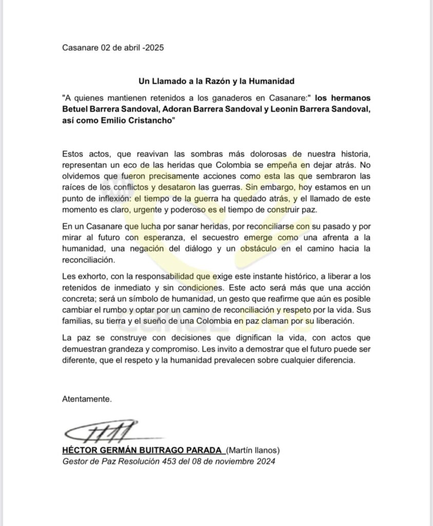 En su comunicado, Buitrago hace un llamado urgente a quienes mantienen en cautiverio a los hermanos ganaderos Betuel, Adoran y Leonin Barrera Sandoval, así como a Emilio Cristancho, quienes fueron secuestrados en días recientes en el departamento de Casanare.