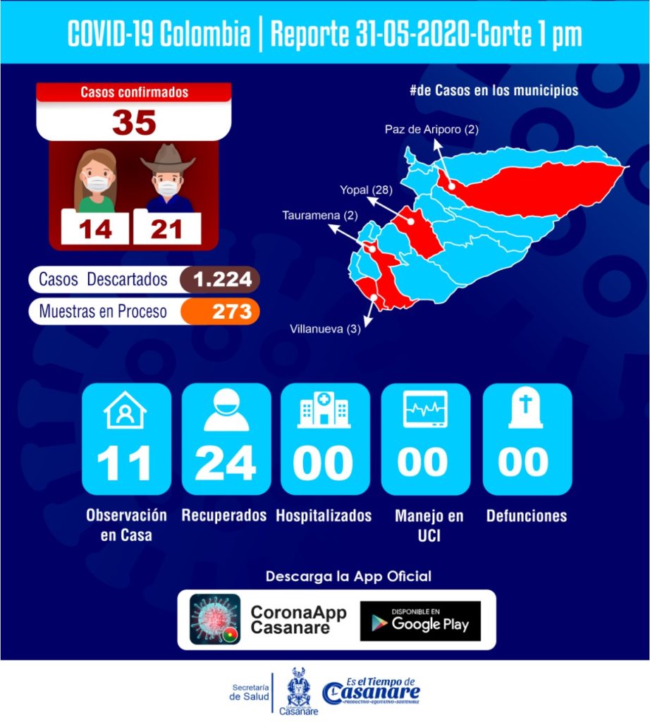 Instituto Nacional de Salud confirma un nuevo caso de COVID-19 para Casanare. La cifra de notificaciones positivas asciende a 35