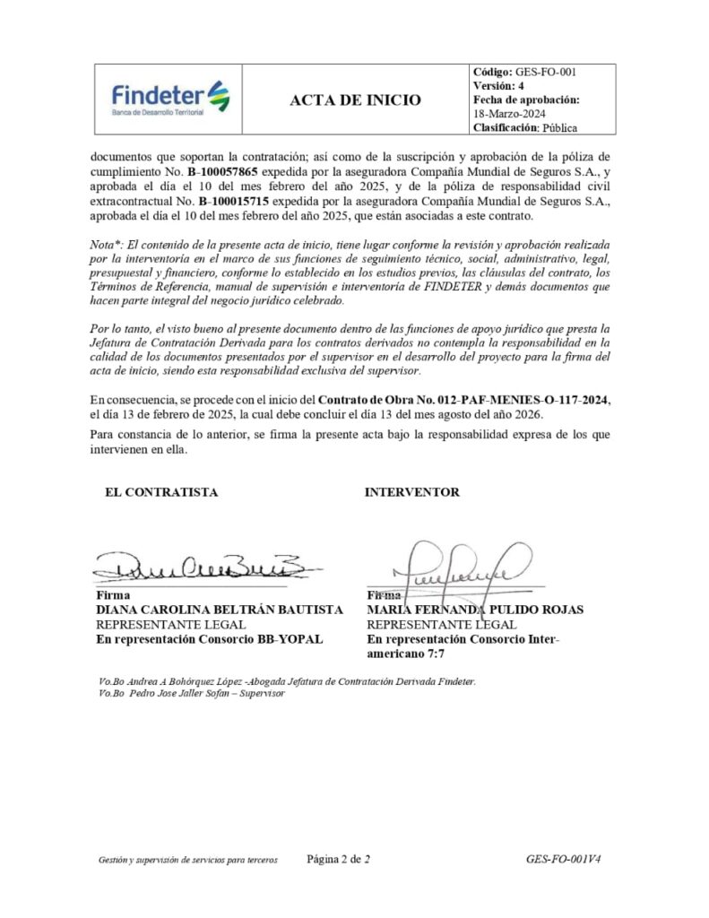 La colectividad presentó como respaldo una copia del contrato de obra 012-PAF-MENIES-O-117-2024 y el acta de inicio expedida por Findeter.