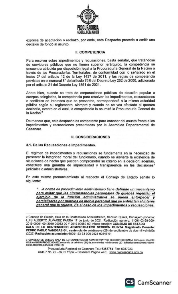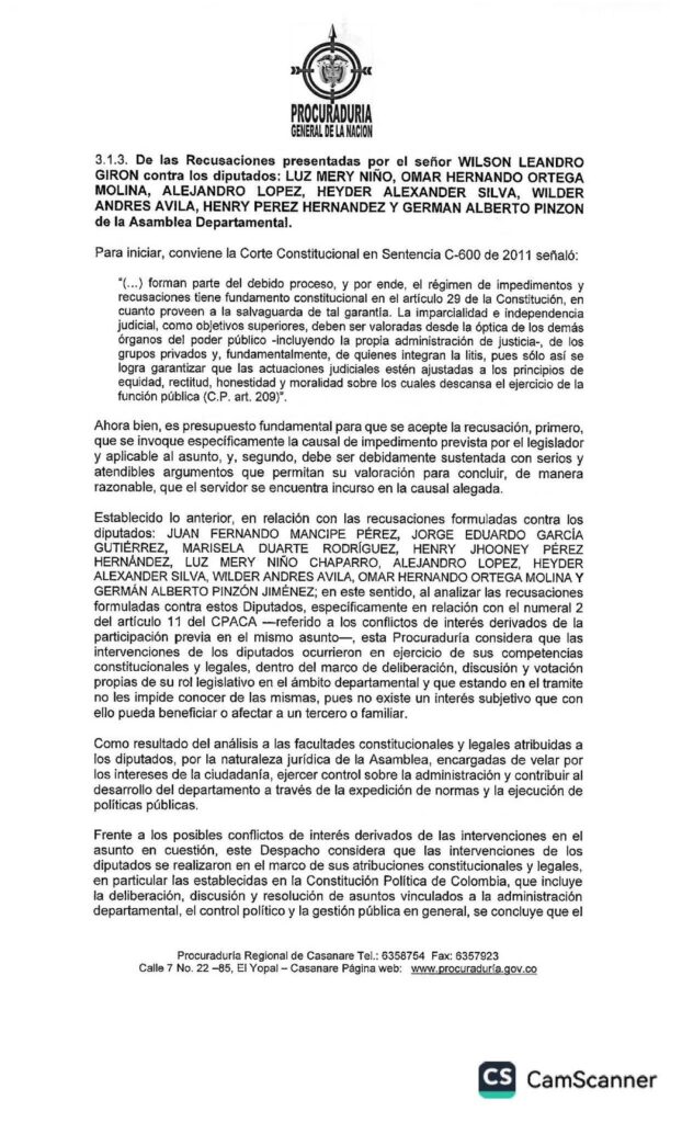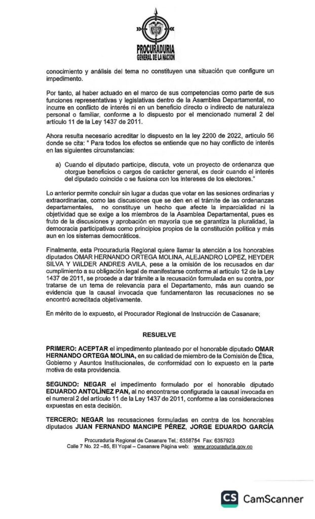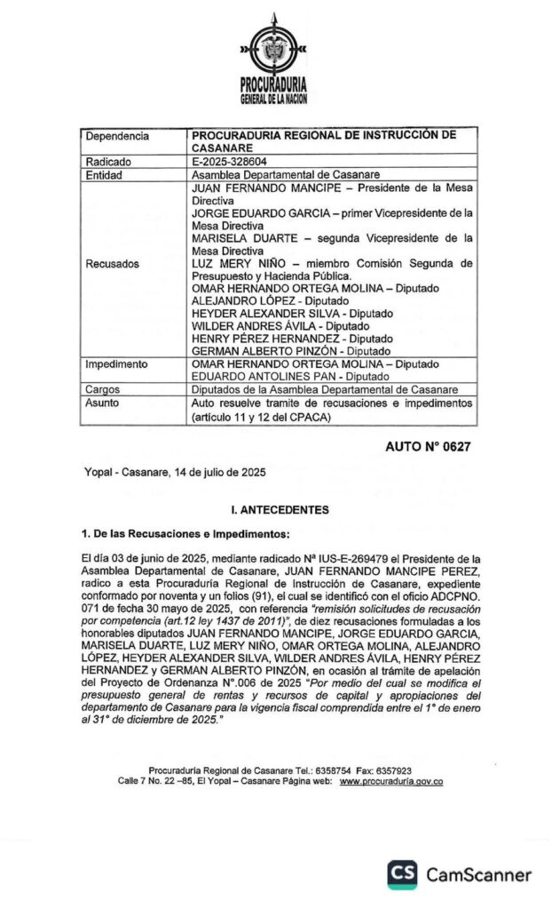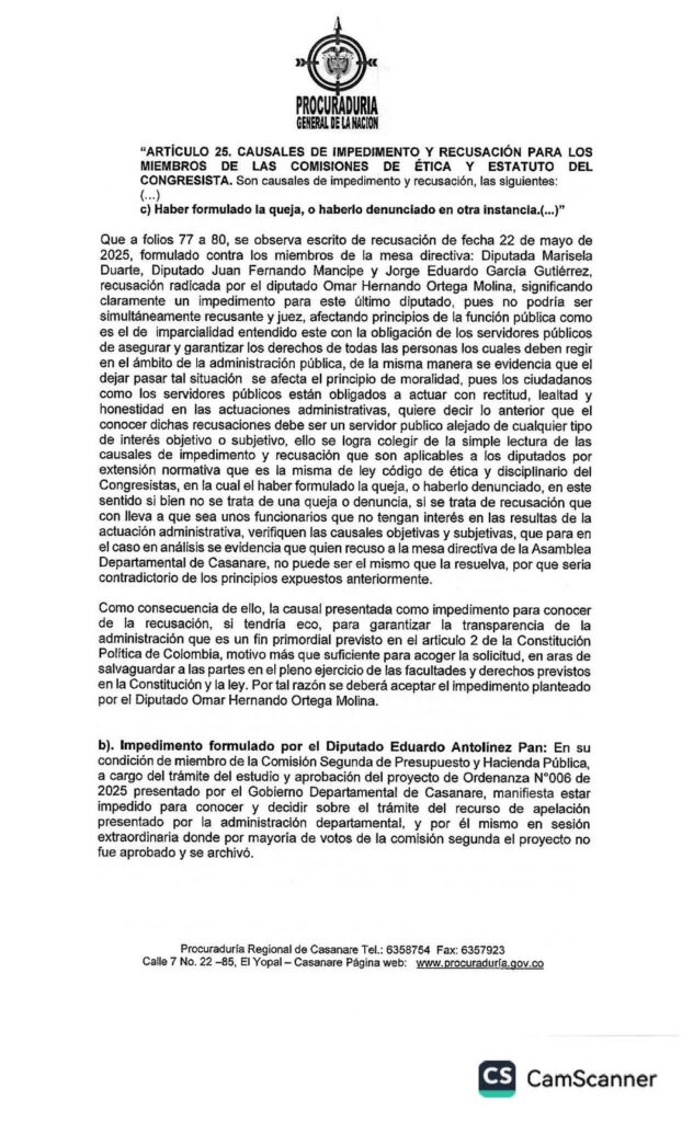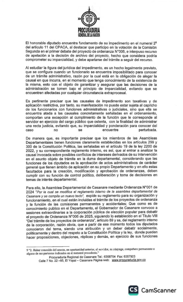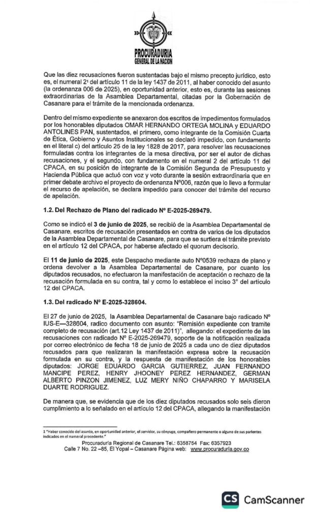 En medio de los señalamientos cruzados entre la Gobernación de Casanare y la Asamblea Departamental respecto al trámite del Proyecto de Ordenanza 006 de 2025, la Procuraduría Regional se pronunció con un fallo que aclara aspectos claves sobre los impedimentos y recusaciones presentados por algunos diputados.