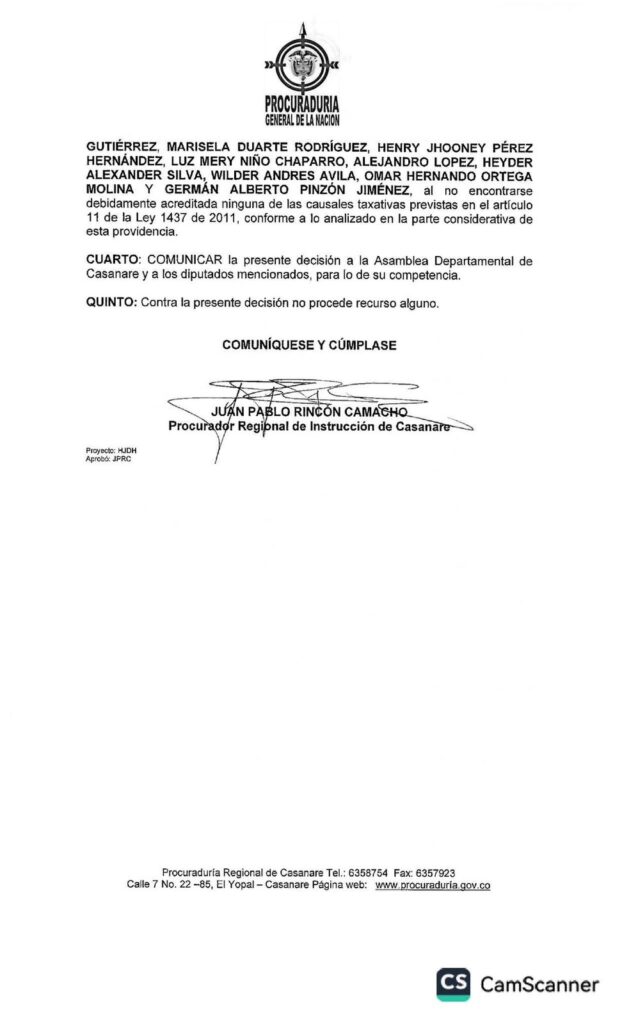 ⚫️4. Se ordena comunicar esta decisión a la Asamblea Departamental de Casanare y a los diputados mencionados, para que procedan conforme a sus competencias.