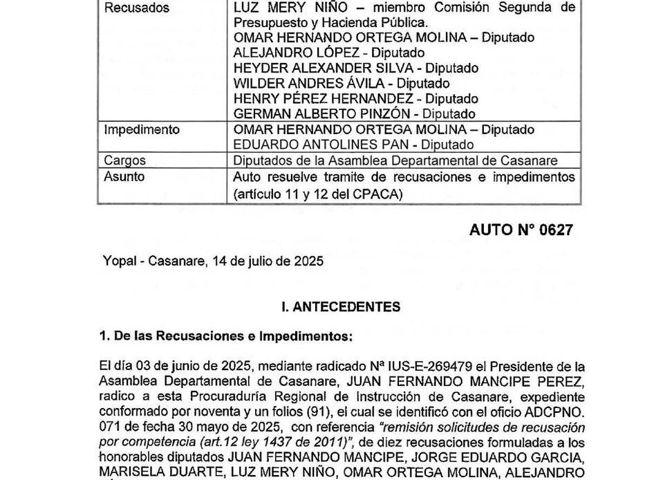 En medio de los señalamientos cruzados entre la Gobernación de Casanare y la Asamblea Departamental respecto al trámite del Proyecto de Ordenanza 006 de 2025, la Procuraduría Regional se pronunció con un fallo que aclara aspectos claves sobre los impedimentos y recusaciones presentados por algunos diputados.