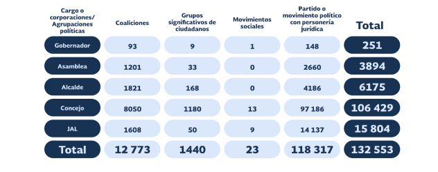 De los 132 553 candidatos, 251 se inscribieron para el cargo de gobernador, 93 lo hicieron a través de coaliciones, 9 por grupos significativos de ciudadanos, 1 por movimientos sociales y 148 por partidos o movimientos políticos; y 3894 candidatos se