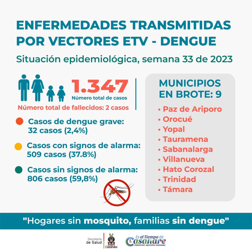 El Sistema de Vigilancia Epidemiológica – SIVIGILA, notificó para la semana 33 un total de 25 nuevos casos de dengue en todo el departamento de Casanare, los cuales corresponden a los municipios de Paz de Ariporo (9), Yopal (6), Villanueva (3), San Luis de Palenque (2), Aguazul (1), Hato Corozal (1), Tauramena (1), Orocué (1) y Trinidad (1).