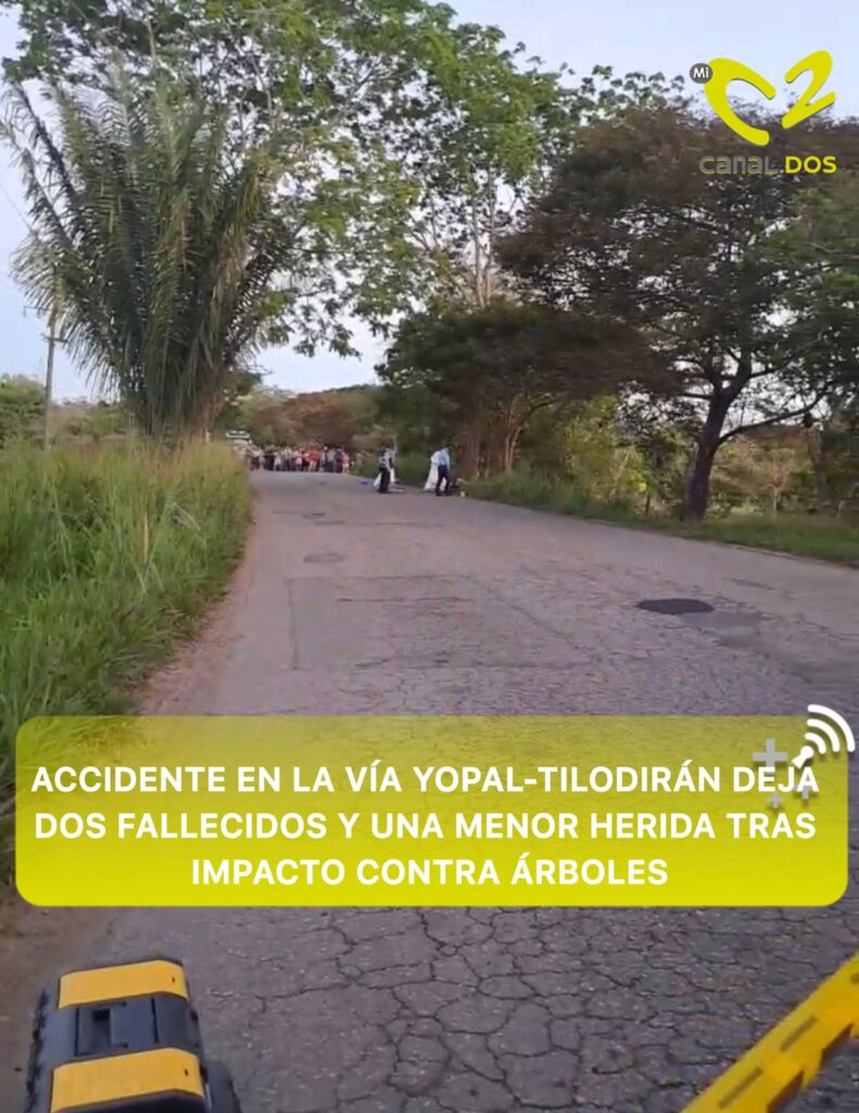 Un trágico accidente de tránsito ocurrido en la tarde del lunes 25 de noviembre cobró la vida de dos personas y dejó a una menor herida en la VÍA YOPAL-TILODIRÁN, específicamente en el kilómetro 12.