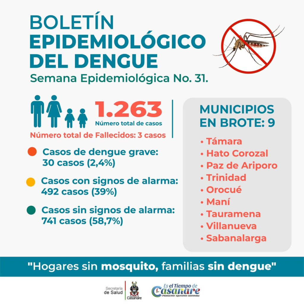 De acuerdo con este informe, a la semana No. 31 se han registrado un total de 1.263 casos de dengue, de estos, 741 (58,7%) fueron clasificados como dengue sin signos de alarma, 492 (39%) con signos de alarma y 30 (2,4%) dengue grave. Respecto a los fallecimientos, el departamento registra tres (3) decesos por dengue.