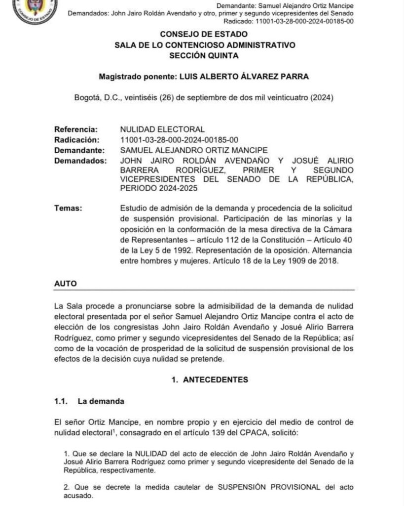 El Consejo de Estado ha admitió una demanda que cuestiona la elección de Alirio Barrera como segundo vicepresidente del Senado. Esta decisión se produce tras la ponencia del magistrado Luis Alberto Álvarez Parra.