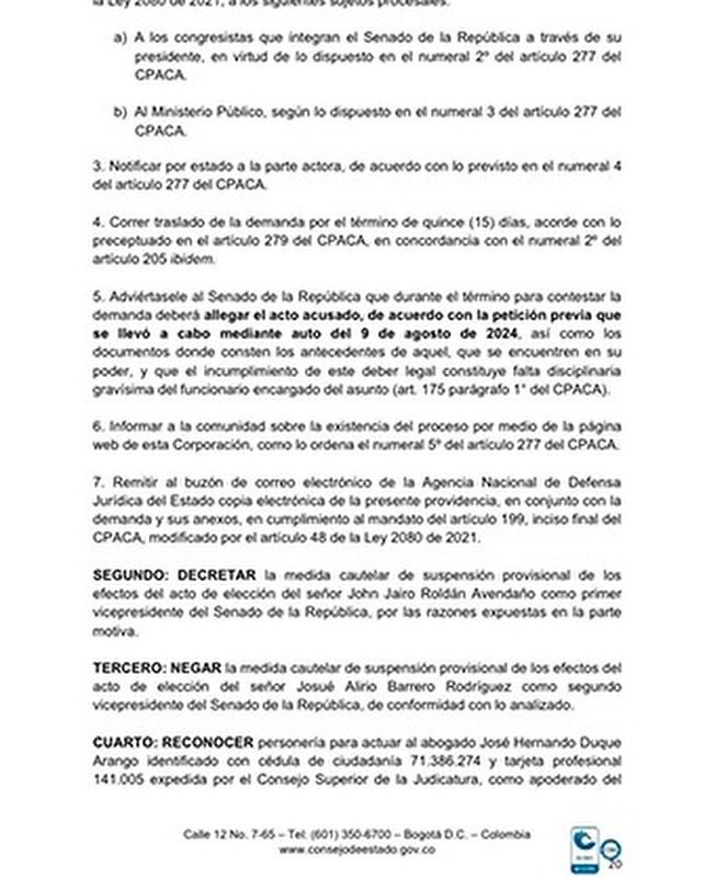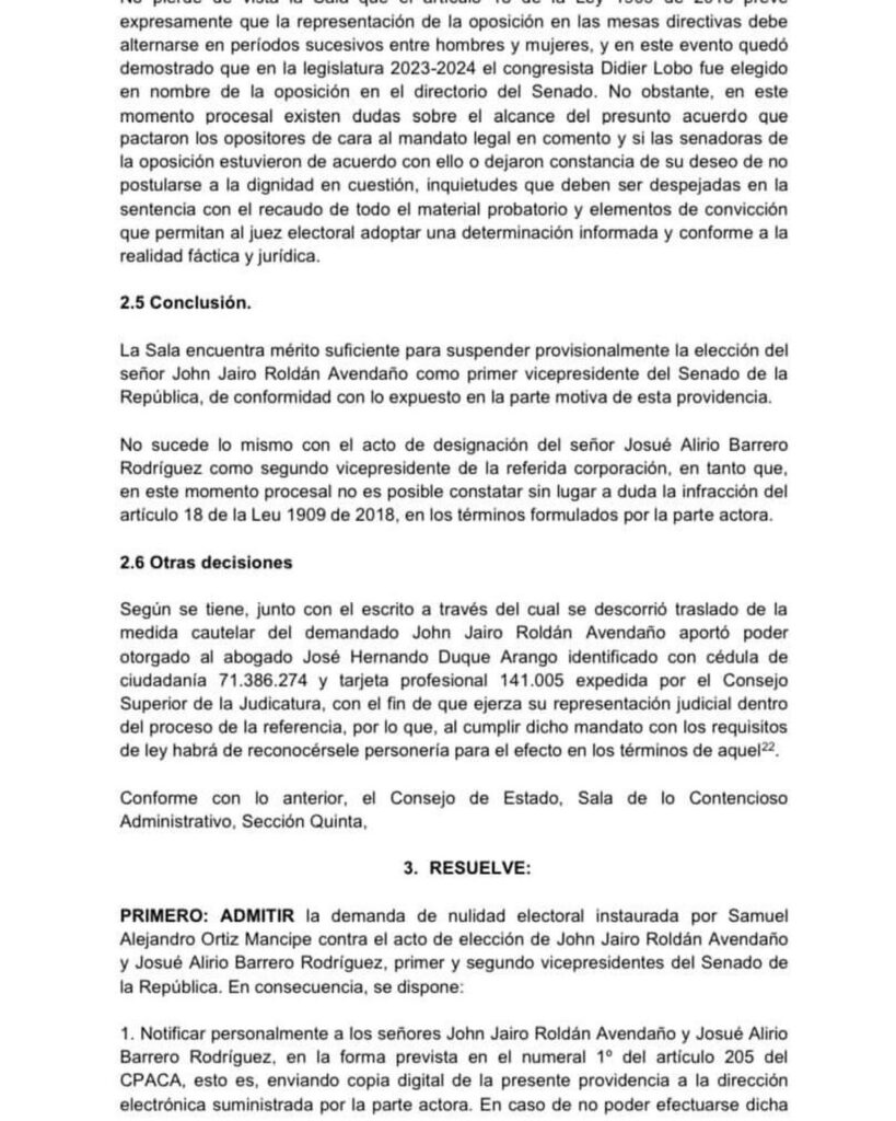 Además, el Consejo evaluó otros artículos relevantes de la Constitución y leyes relacionadas, antes de decidir admitir la demanda. Como resultado, se ha anulado la elección de Roldán como primer vicepresidente y se ha suspendido del cargo, argumentando que su partido (Liberal), no es considerado una minoría en el Senado debido a su número de escaños, 19 en total.