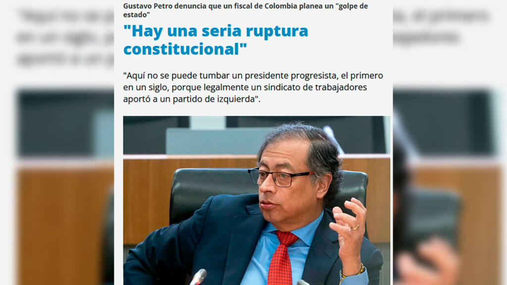 Página 12, de Argentina, informó: “Gustavo Petro denuncia que un fiscal de Colombia planea un «golpe de Estado» y agregó que “el presidente colombiano, Gustavo Petro, viene denunciando acciones para sacarlo del poder y volvió a acusar a la Fiscalía de querer investigarlo, por lo que pidió la movilización popular en su apoyo».