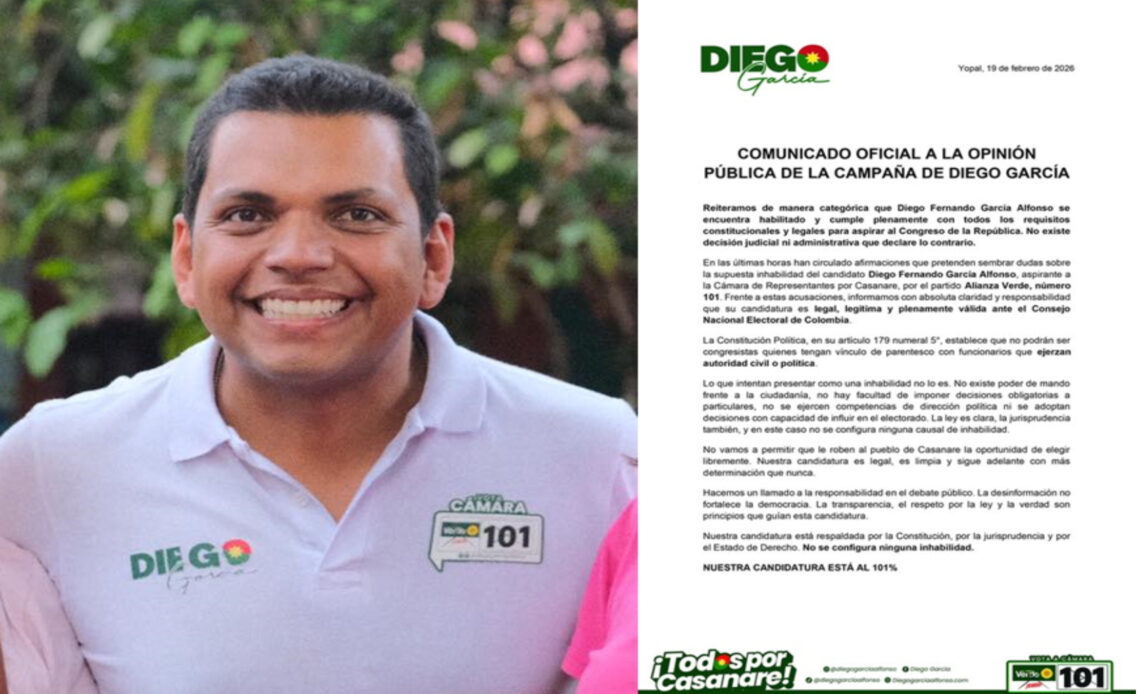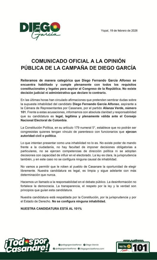 En un comunicado oficial emitido desde Yopal con fecha del 19 de febrero de 2026, el equipo de campaña de Diego Fernando García Alfonso reafirmó la legalidad de su candidatura a la Cámara de Representantes por el departamento de Casanare.