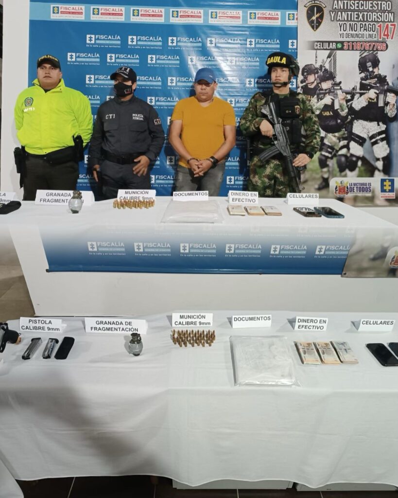 El allanamiento donde se dio captura a este sujeto tuvo lugar en el Barrio Los Almendros de Yopal, incautando una pistola 9mm, 30 cartuchos de calibre 9mm, dos proveedores para pistola, una granada de desfragmentación y dos teléfonos celulares, material que era usado para amedrentar y aterrorizar a las víctimas de extorsión, incautando además una suma de 6 millones cien mil pesos en efectivo, producto al parecer de este delito.