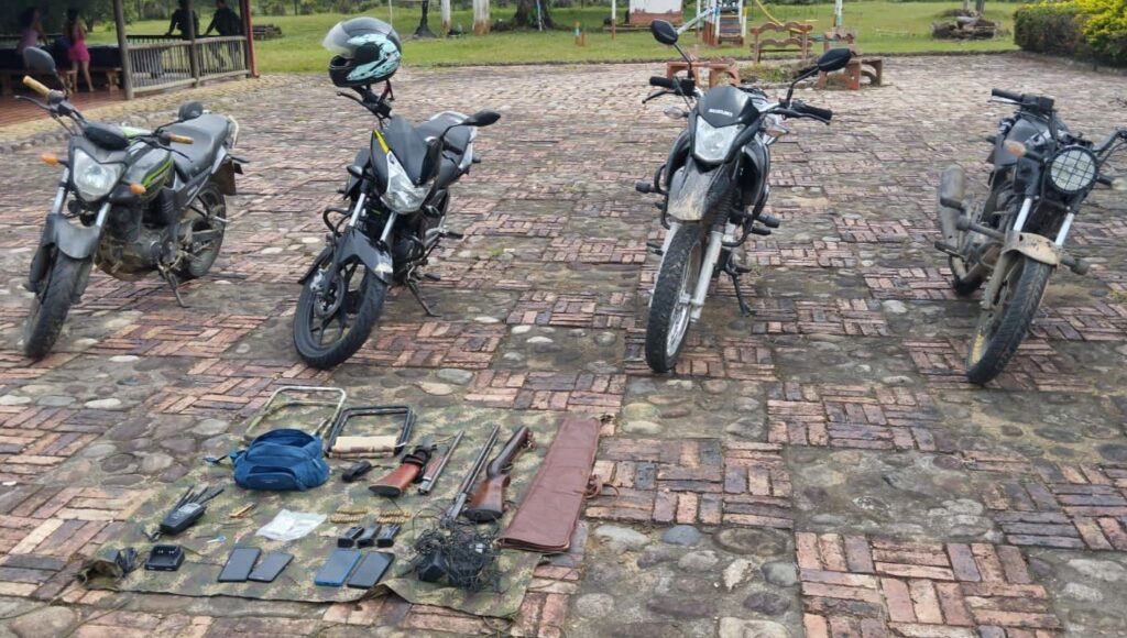 En el lugar de las capturas se incautaron cuatro motocicletas, armas largas tipo escopeta y carabina, munición, una granada de mano, material de intendencia y comunicaciones (un radioteléfono satelital de última generación, celulares y tarjetas SIM, desde donde realizaban llamadas extorsivas); así mismo, talonarios membreteados con las letras AGC, con los que realizarían el cobro de las extorsiones. Este material fue dejado a disposición de las autoridades competentes.