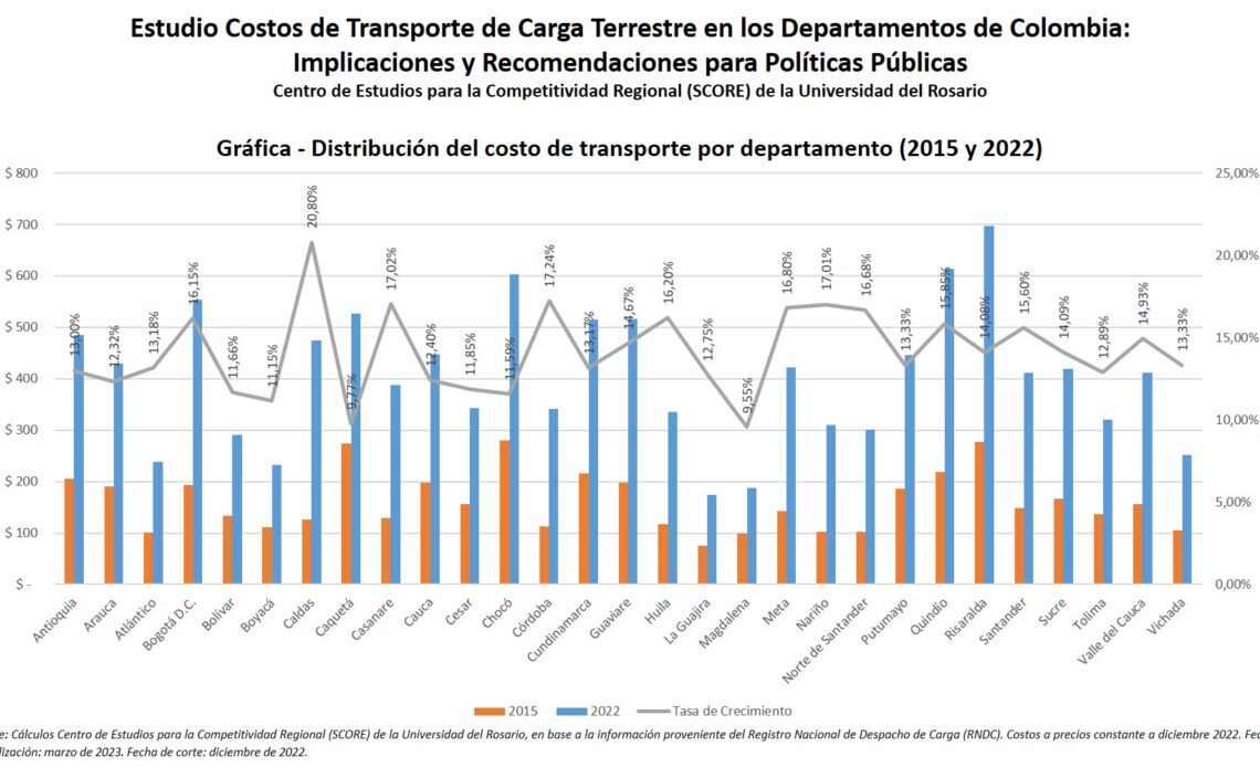 Bogotá, junio 28 de 2023. Una tendencia al alza de los costos del transporte de carga terrestre por kilómetro y tonelada se registran en diversos departamentos del país, los cuales varían dependiendo del estado de las vías de cada región, según un informe del Centro de Estudios para la Competitividad Regional (SCORE) de la Universidad del Rosario.