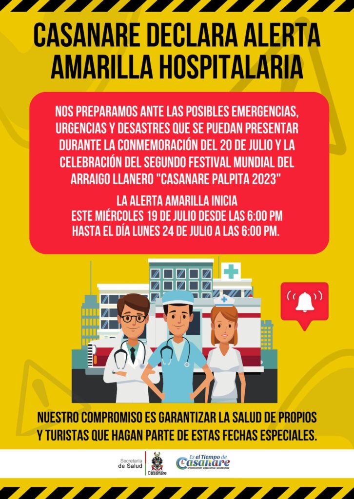 Ante la celebración y conmemoración del 20 de Julio como fiesta Patria y en el marco del Festival Mundial del Arraigo Llanero “Casanare Palpita 2023”, que tendrá lugar del 20 al 23 de julio respectivamente, y al ser eventos donde se va a presentar una gran afluencia de personas hacia el departamento, la Gobernación de Casanare en aras de generar una oportuna y eficiente respuesta en la atención de la población que pueda verse en situaciones de urgencias, emergencias y/o desastres, solicitó a las entidades promotoras de salud- EPS, instituciones prestadoras de servicios de salud- IPS públicas y privadas, hacer la activación de los respectivos planes de contingencia, verificación y dotación de medicamentos, insumos, dispositivos médicos, gases medicinales, elementos de protección personal, entre otros necesarios para la atención de cualquier situación que ponga en riesgo la vida y/o seguridad de los propios y turistas que se encuentren disfrutando de los diferentes eventos programados.