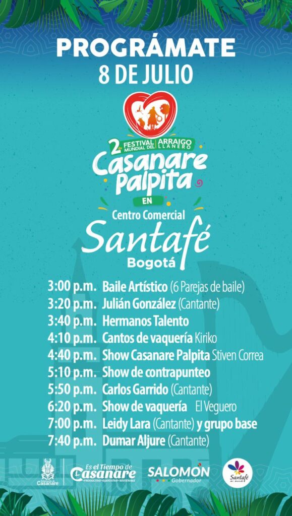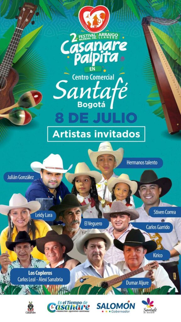El Festival Llanero “Casanare Palpita” en el centro comercial Santafé, será una oportunidad única para disfrutar de la cultura y el folclore de la región. Los asistentes podrán sumergirse en los ritmos del joropo, los cantos de vaquería y las melodías del arpa, el cuatro y las maracas, creando un ambiente de alegría y celebración.