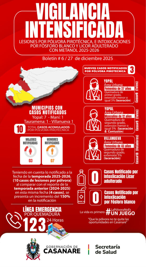Con corte al 27 de diciembre de 2025, el departamento de Casanare ha reportado un total de 10 casos confirmados de lesiones por pólvora pirotécnica. Según el boletín epidemiológico, tres de estos casos ingresaron en las últimas 24 horas antes del cierre del reporte.