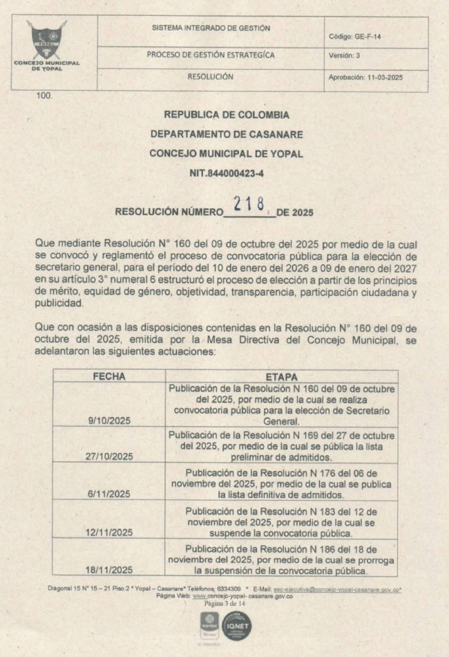 El Concejo Municipal de Yopal ha emitido la Resolución N° 218 de 2025, revocando directamente los actos administrativos que iniciaron y desarrollaron la convocatoria pública para la elección del secretario general, cuyo periodo estaba previsto del 10 de enero de 2026 al 9 de enero de 2027.