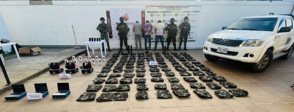 Por otra parte, en una operación coordinada con la Policía Nacional en un puesto de control ubicado en la Y de Rondón, en el municipio de Tame, Arauca, mediante puesto de control, se verifico un vehículo en el que se movilizaban tres personas y durante la inspección se hallaron en su interior 100 pantalones pinta pixelada de uso privativo de las Fuerzas Militares, cinco medios de comunicación, celulares, tres computadores marca Lenovo, tres equipos de carga eléctrica, 10 Cámaras Electronic Flash y tres pares de botas de caucho nuevas, que según inteligencia militar iban con destino a las filas de los delincuentes del grupo armado organizado GAO residual Estructura 10 disidencias Farc.