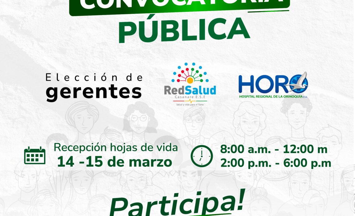 La Gobernación de Casanare mediante el Decreto 0067 del 2024 “Por medio del cual se hace una invitación pública para conformar banco de hojas de vida para la selección de los gerentes de las Empresas Sociales del Estado del orden departamental y se fijan las condiciones para la participación”  hace pública esta convocatoria con el ánimo de de elegir los gerentes para las ESES Red Salud Casanare y Hospital Regional- HORO de la Orinoquia en el periodo 2024-2028.