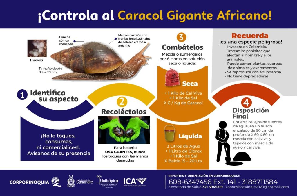 Los reportes de infestación con caracol gigante africano, pueden presentarse ante Oficinas de Salud Pública Municipal, Oficinas locales del ICA y Alcaldías, así como ante Corporinoquia, al celular 3188751584, y Secretaría de Salud (3213945319), para establecer los enlaces que permitan coordinar con las comunidades afectadas, las jornadas de capacitación y control de la especie.