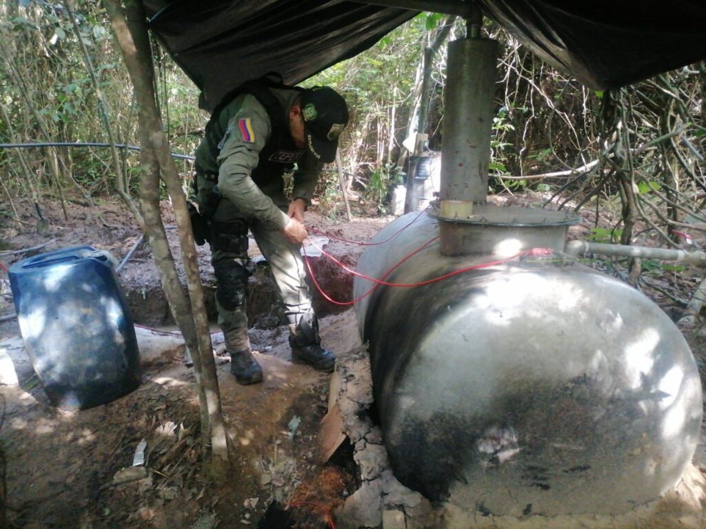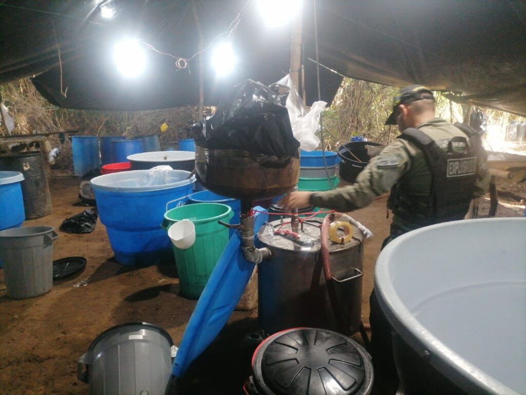Así mismo, en el lugar fueron incautados dos teléfonos celulares, memorias USB, una máquina de centrifugado artesanal para mezclar químicos, un refinador artesanal llamado ‘marciano’; un destilador artesanal, ‘gusano’; un molde de empacado y máquina de plástico para contramarcar, 4 hornos microondas y 200 sobres de papel para secado, entre otros. El material fue dejado a disposición de las autoridades competentes, y la estructura fue destruida de manera controlada, de acuerdo a los protocolos y parámetros legales vigentes.