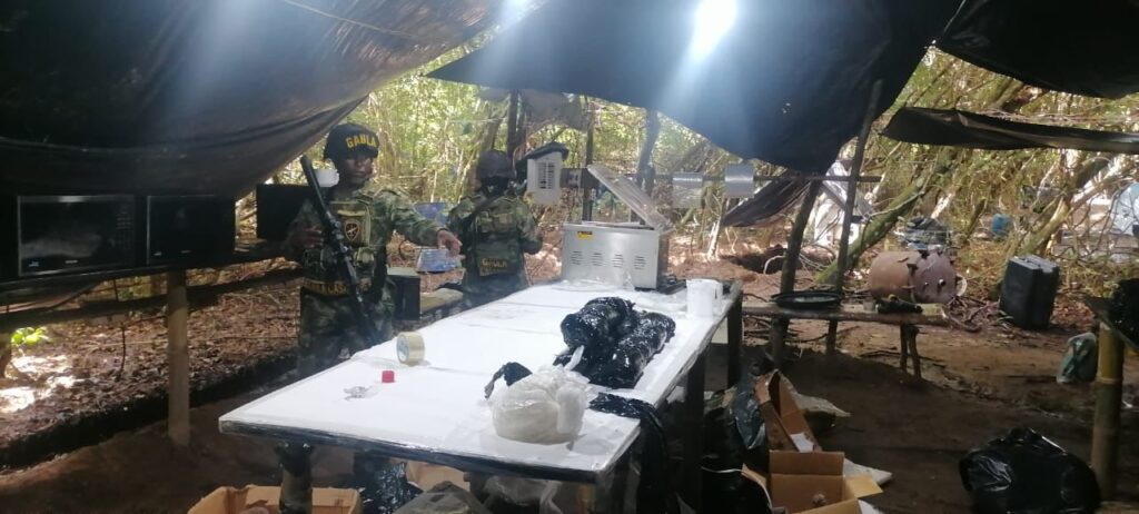 La información recopilada permitió la ubicación de este laboratorio que pertenecería al grupo armado organizado Clan del Golfo. En esta estructura hecha en madera y plástico y escondida en un área boscosa, se incautaron más de 40 kilos de cocaína, al igual que insumos líquidos y sólidos para la producción de este estupefaciente.