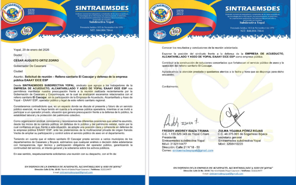 Finalmente, indicaron que enviaron un oficio a la Gobernación de Casanare solicitando una explicación de las razones por las cuales no invitaron a la reunión a la Empresa de Acueducto y Alcantarillado de Yopal (EAAAY) y a ellos como sindicato.
