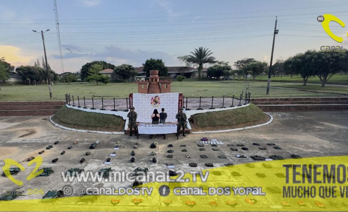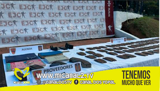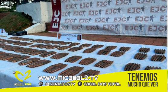 Así mismo, se logra la incautación de más de 700 municiones calibre 7.62 para fusil AK 47, 3 proveedores para fusil AK47, 3 granadas calibre 40 mm, material explosivo y 5 artefactos tipo mina antipersonal, además de material de intendencia como equipos de campaña, un camuflado tipo camaleón, uniformes tipo policía, buzos, sudaderas, hamacas, toldillos y ponchos, gorras, brazaletes y parches alusivos al ELN.