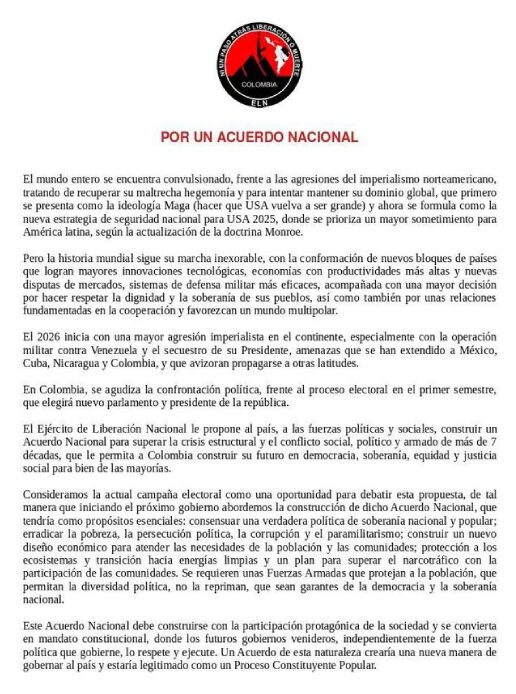 En un reciente comunicado titulado «Por un Acuerdo Nacional», el Ejército de Liberación Nacional (ELN) manifestó su intención de promover un consenso de país que involucre a fuerzas políticas y sociales.