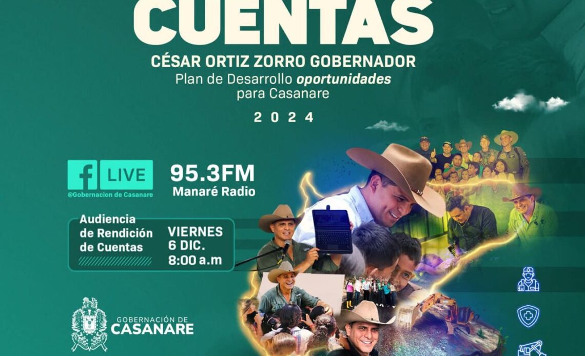 Este viernes, 6 de diciembre, a partir de las 8:00 a.m., el gobernador César Ortiz Zorro, acompañado de su equipo de Gobierno, llevará a cabo la audiencia pública de rendición de cuentas correspondiente al primer año de gestión y a los avances del Plan de Desarrollo «Oportunidades de Casanare».
