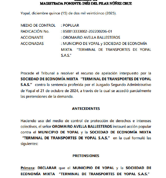 La autoridad judicial ratificó este 15 de diciembre que el Municipio de Yopal y la Sociedad de Economía Mixta “Terminal de Transportes de Yopal S.A.S.” vulneraron el derecho colectivo a la moralidad administrativa en el proceso de adquisición del predio “El Rodeo” ubicado en la vía a Morichal, el cual, inicialmente, estaba destinado al nuevo terminal de transportes de la ciudad.