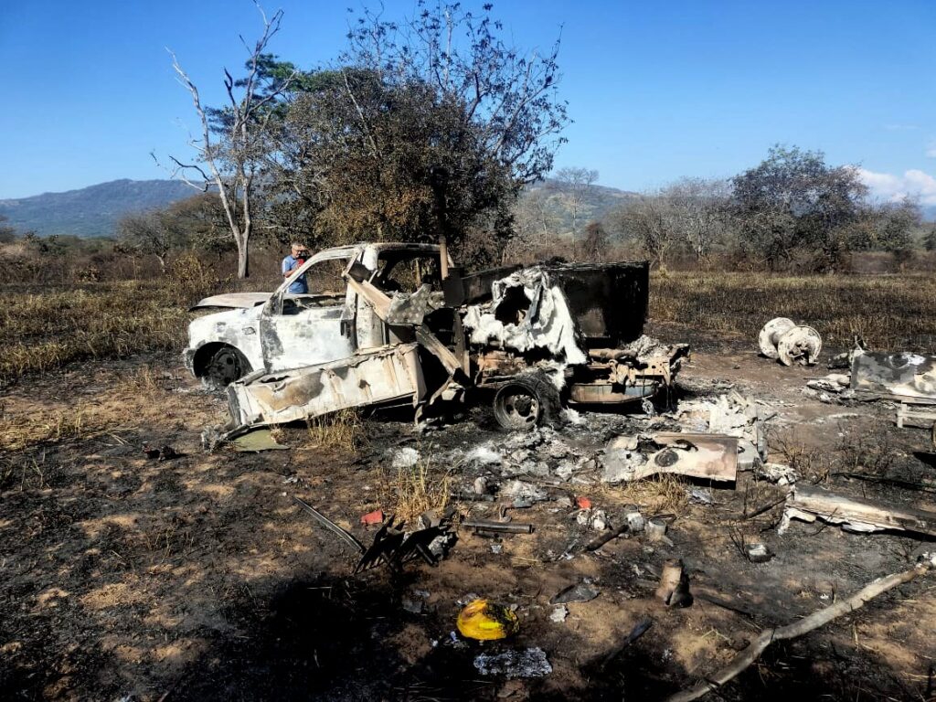 Sin embargo y a pesar de los esfuerzos, el carro de rescate del cuerpo de bomberos, de placas OSE 654, MÓVIL 03, se prendió en llamas y quedó en pérdida total en la mitad de la humeante pradera.