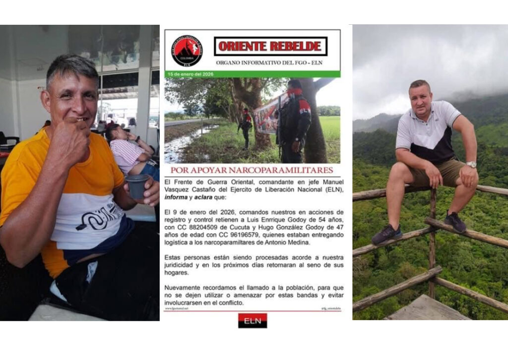 Frente al secuestro de dos ciudadanos identificados como Luis Enrique Godoy, de 54 años, natural de Cúcuta y Hugo González Godoy, de 47 años, el grupo armado ilegal expidió un comunicado donde hace referencia a este plagio.