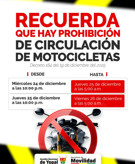 Argumentando el alto índice de siniestros viales y las elevadas cifras de personas fallecidas en accidentes de tránsito, la Alcaldía de Yopal expidió el Decreto 184 del 19 de diciembre, con el cual prohíbe la circulación de motocicletas durante las fiestas de Navidad y Año Nuevo.