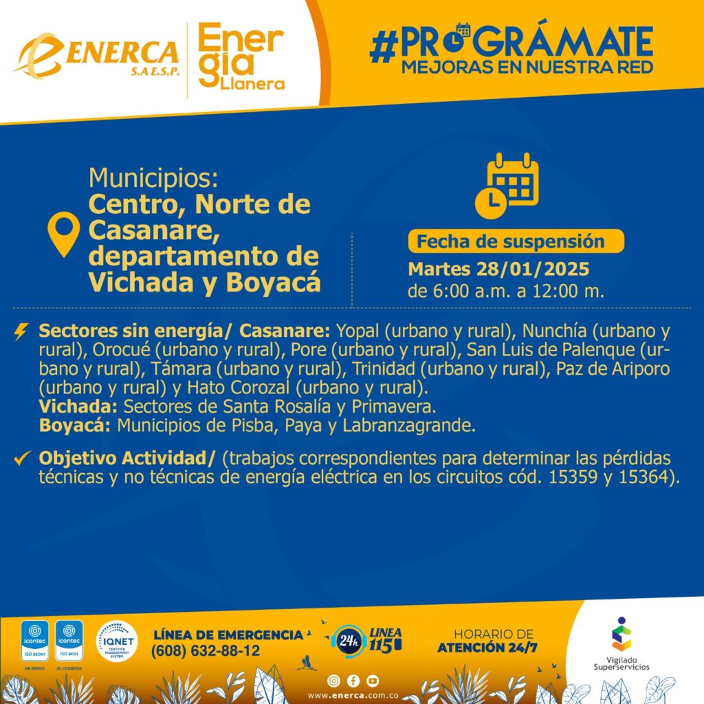 La Empresa de Energía de Casanare (Enerca S.A. E.S.P.) informa a la comunidad sobre el mantenimiento programado de gran impacto que se llevará a cabo el próximo 28 de enero de 2025 en varias zonas del norte y centro de Casanare, así como en los departamentos de Vichada y Boyacá.