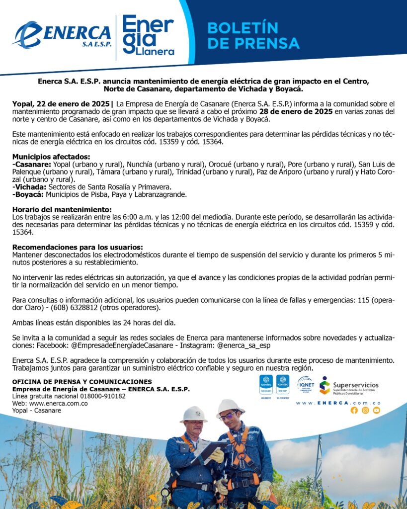 La Empresa de Energía de Casanare (Enerca S.A. E.S.P.) informa a la comunidad sobre el mantenimiento programado de gran impacto que se llevará a cabo el próximo 28 de enero de 2025 en varias zonas del norte y centro de Casanare, así como en los departamentos de Vichada y Boyacá.