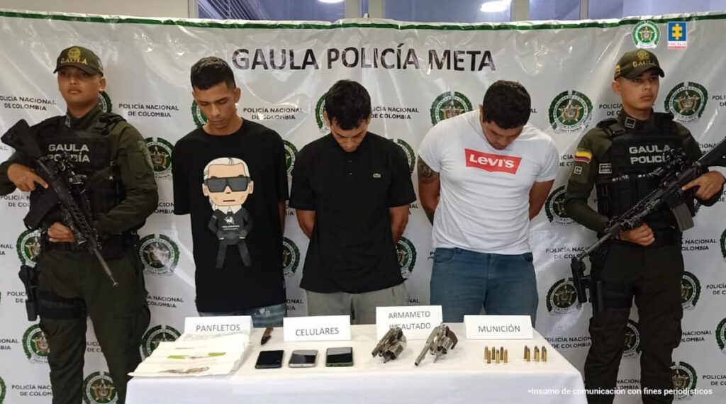 Tres hombres, señalados de pertenecer a la organización criminal conocida como ‘Los Juanitos’, fueron enviados a la cárcel tras ser capturados en flagrancia por el Gaula de la Policía Nacional en el municipio de Acacías (Meta), cuando al parecer planeaban un homicidio.