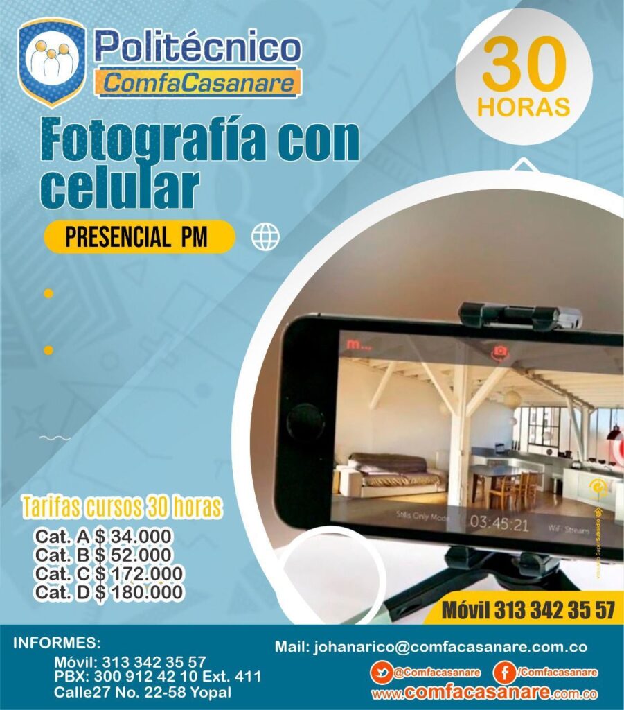 Un experto en 30 horas Descubre las claves técnicas para hacer fotografías artísticas profesionales🏞🌁🌆 y capturar imágenes📸 increíbles utilizando sólo tu celular con el curso “Fotografía con Celular”, 📱que tiene el Politécnico Comfacasanare para ti. Regístrate en el link 👩🏼💻 https://bit.ly/Preinscripciones_cursos o amplía la información a través del móvil: ⏩⏩3133423557. También nos puedes escribir al whatsApp🤳🏻https://bit.ly/Politecnico_CursosCortos
