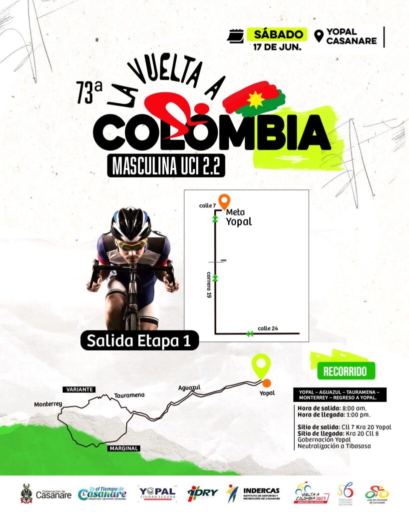Con una recta exigente en la ruta Yopal – Aguazul – Tauramena – Monterrey y un regreso nuevamente a Yopal, las emociones de la Vuelta a Colombia continúan hoy tras dejar en el prólogo inaugural a Miguel Ángel “Supermán” López del Team Medellín. La etapa de este sábado constará de un terreno llano y algunos recorridos escarpados y montañosos, especialmente la parte del recorrido alternativo que recorrerá la etapa, gran parte del cual discurrirá por la carretera Marginal del Llano, al menos hasta las 14.00 horas, los vehículos estarán prohibidos.