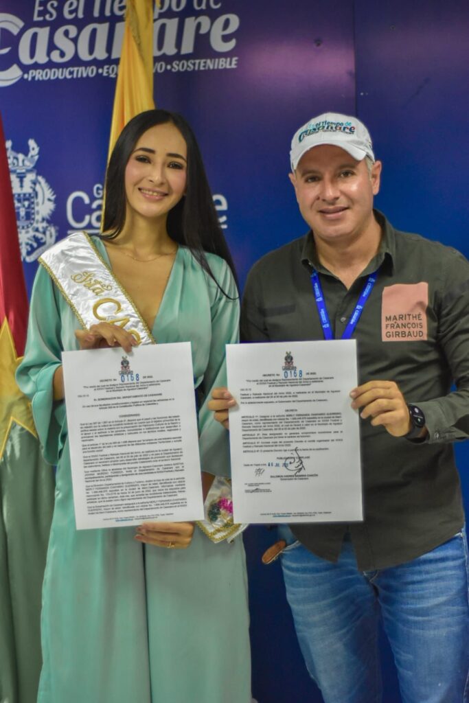 El director Departamental de Cultura y Turismo de Casanare Manuel Alejandro Montagut, realizó la imposición de banda a la Señorita Casanare, al XXXIII Festival y Reinado Nacional del Arroz 2022, Merly Fernanda Chaparro Guerrero, que los representará en el municipio de Aguazul Casanare del 28 al 30 de julio 2022.
