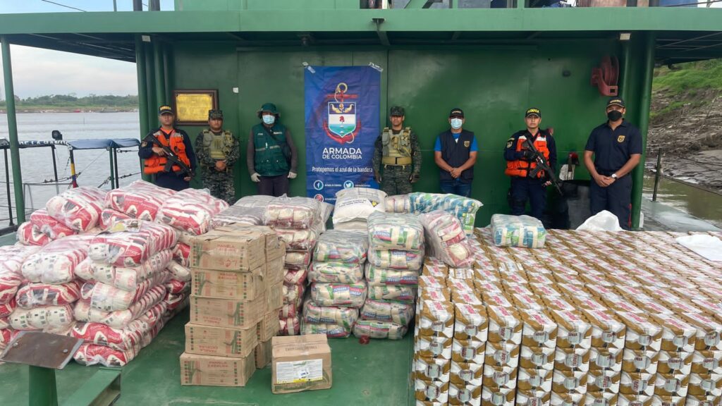 En desarrollo de un dispositivo de control fluvial realizado entre la Armada de Colombia y la Marina de Guerra del Perú sobre el río Amazonas, se logró la incautación de licor, alimentos no perecederos y cárnicos de contrabando, los cuales eran transportados en una embarcación de bandera peruana sin los debidos certificados legales de importación, declaración de impuestos, ni documentación alguna que respaldara la legalidad de la mercancía.