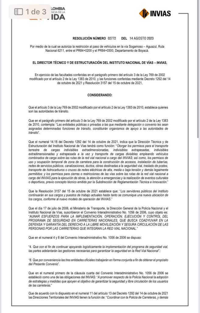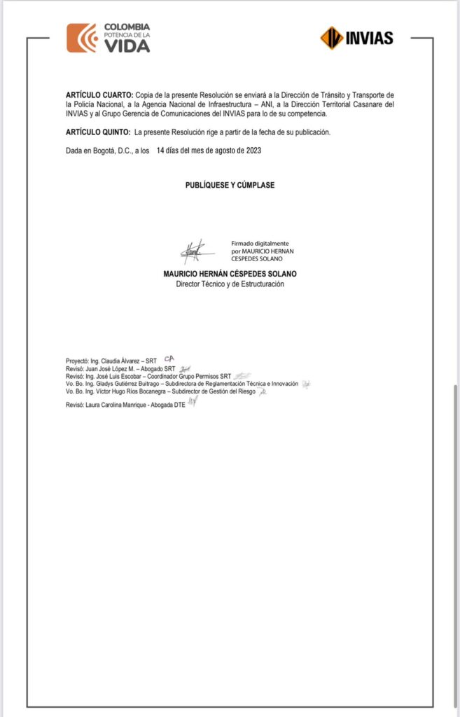 situación de emergencia que se presenta en el puente Quebrada Negra PR84+240, el Instituto Nacional de Vías, Invías, mediante Resolución 02772 del 14 de agosto de 2023, restringió el paso de camiones de todas las categorías, buses y camionetas con peso superior a una tonelada, que conecta los departamentos de Boyacá y Casanare.