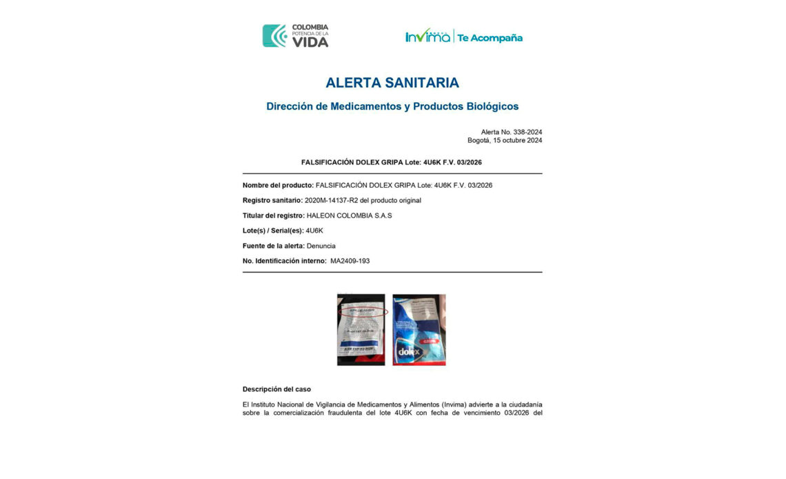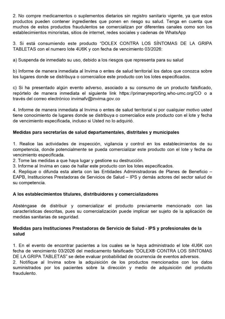 El Instituto Nacional de Vigilancia de Medicamentos y Alimentos (Invima) informa a la ciudadanía que ha sido detectada la comercialización fraudulenta del medicamento DOLEX CONTRA LOS SÍNTOMAS DE LA GRIPA TABLETAS, del lote 4U6K con fecha de vencimiento 03/2026. Este lote ha sido identificado como falsificado, según la notificación realizada por el titular del registro sanitario, HALEON COLOMBIA S.A.S., quien confirmó que este producto no ha sido fabricado, importado ni distribuido en Colombia por su compañía.