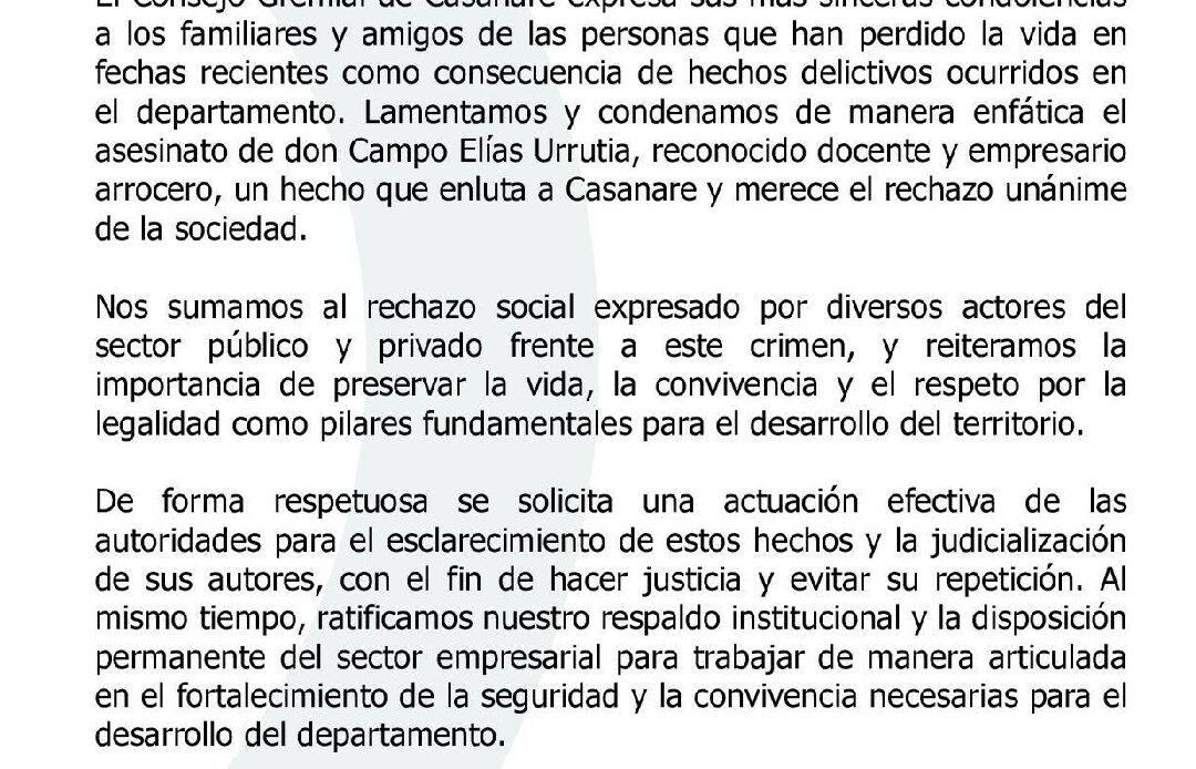 A través de un comunicado de prensa, el Consejo Gremial de Casanare condenó de manera enérgica el reciente asesinato del arrocero Campo Elías Urrutia, ocurrido el 15 de diciembre en zona rural de Tauramena.